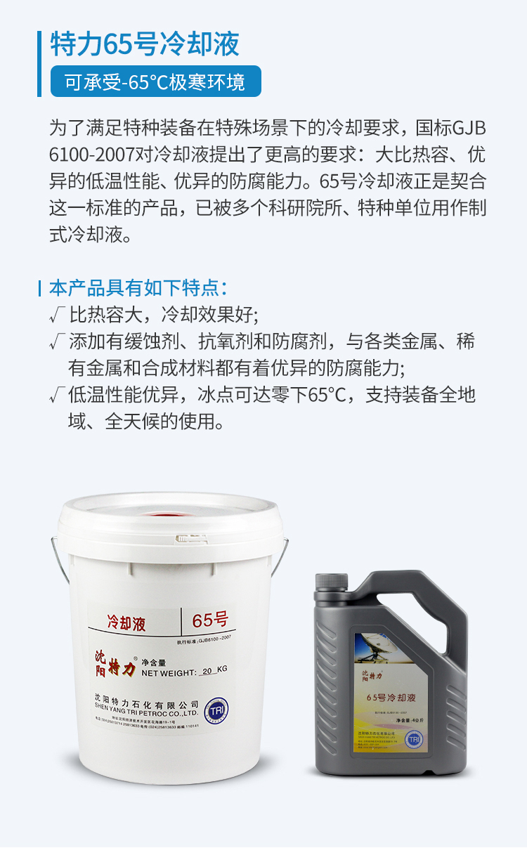為了滿足特種裝備在特殊場景下的冷卻要求,國軍標(biāo)GJB 6100-2007對冷卻液提出了更高的要求:大比熱容、優(yōu)良的低溫性能、優(yōu)良的防腐能力。65號冷卻液正是契合這一標(biāo)準(zhǔn)的產(chǎn)品,已被多個(gè)科研院所、部隊(duì)單位用作制式冷卻液。主要有以下特點(diǎn):