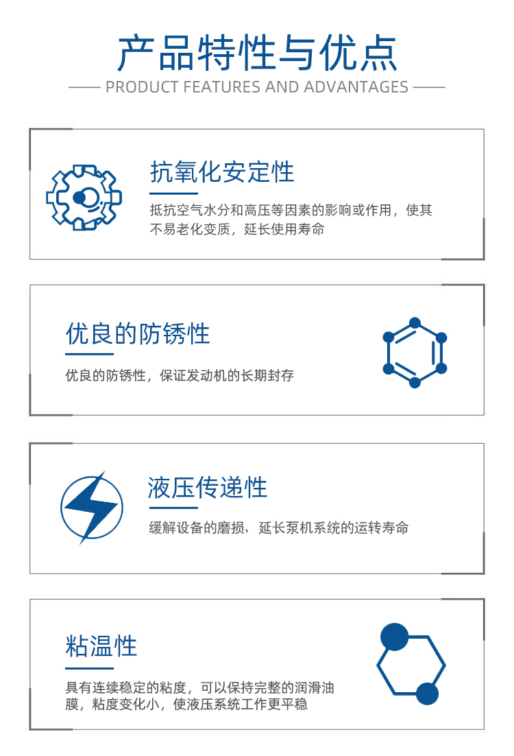 具有連續(xù)穩(wěn)定的粘度,可以保持完整的潤滑油膜,使液壓系統(tǒng)工作更平穩(wěn)。