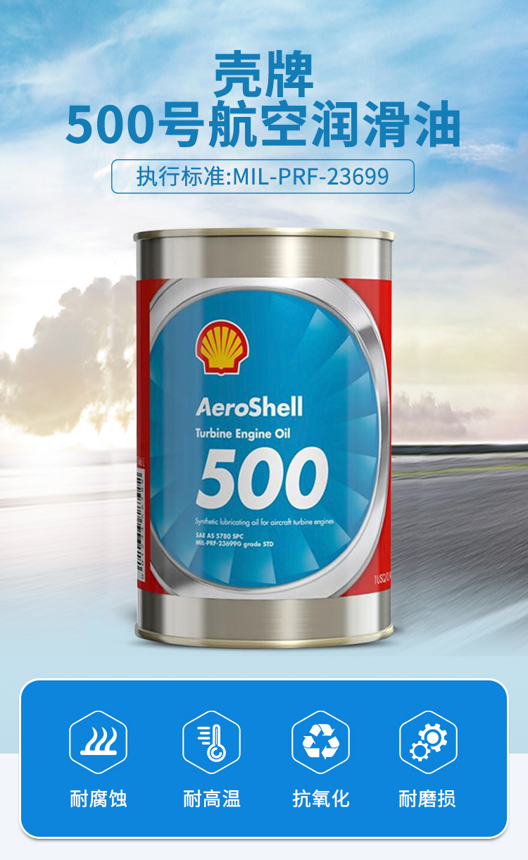 殼牌500航空渦輪發(fā)動(dòng)機(jī)潤(rùn)滑油(AeroShell Turbine Oil 500)的開發(fā)主要是為了滿足Pratt & Whitney 521 B型II和MIL-L-23699規(guī)范的要求,是適合于民用和軍用發(fā)動(dòng)機(jī)需要的這個(gè)類的潤(rùn)滑劑。
