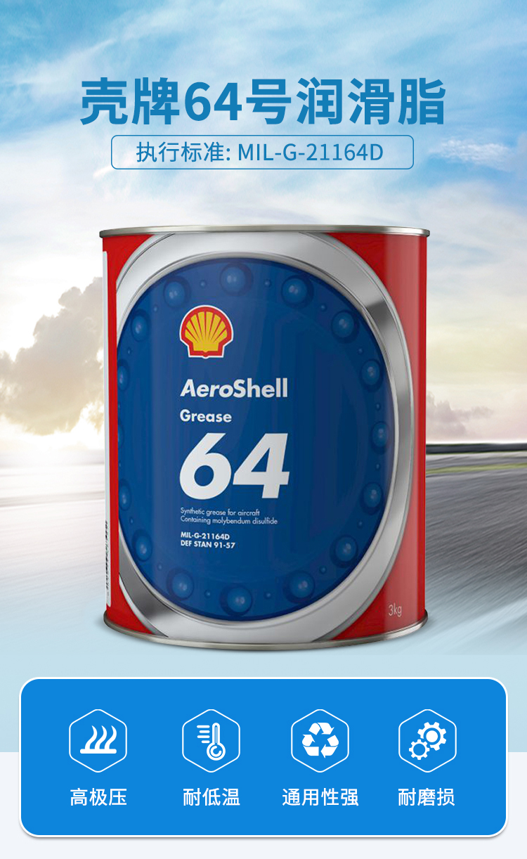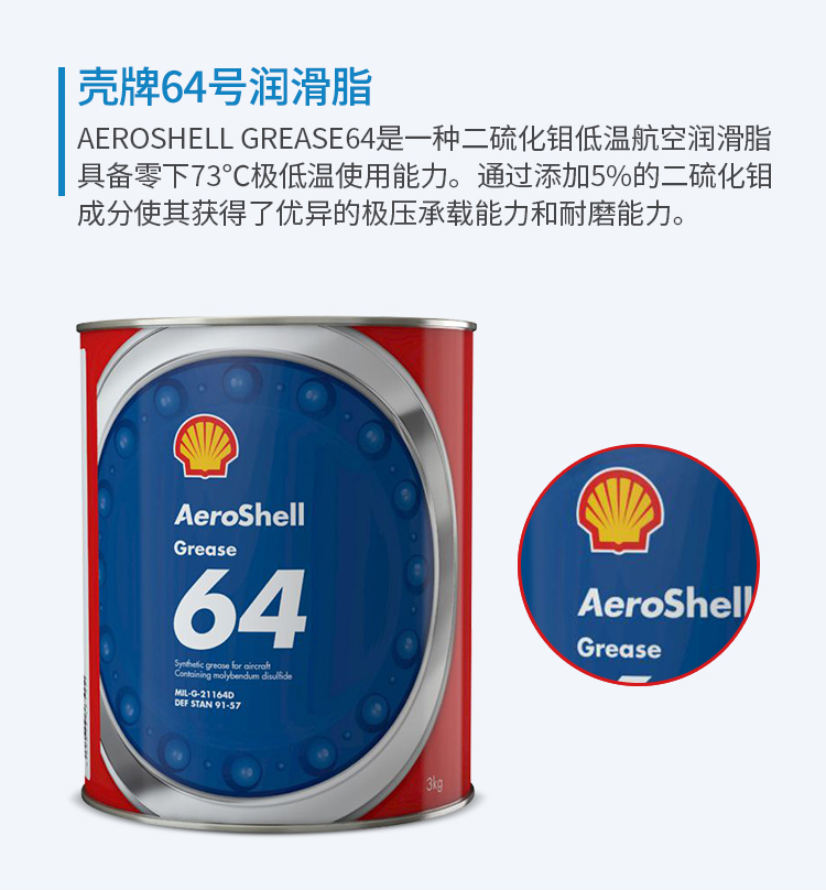AeroShell Grease 64是一種二硫化鉬低溫航空潤滑脂。它具備零下73℃極低溫使用能力。殼牌64號通過添加5%的二硫化鉬成分使其獲得了優(yōu)良的極壓承載能力和耐磨能力。該脂廣泛應用于各類軍、民、通航飛機上。