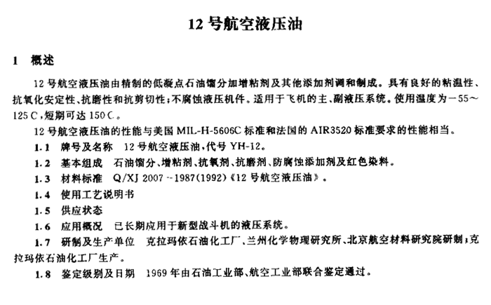 12號(hào)油由克拉瑪依煉油廠、蘭州化學(xué)物理研究所和北京航空材料研究院聯(lián)合研制,由克拉瑪依煉油廠生產(chǎn)。該型號(hào)于1969年由石油工業(yè)部、航空工業(yè)部聯(lián)合鑒定通過(guò)。