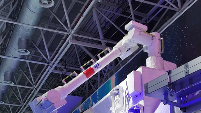 除了主要的艙體之外,我們?cè)诂F(xiàn)場(chǎng)還可以看到包括太陽(yáng)機(jī)翼、中繼天線、對(duì)接機(jī)構(gòu)、大小機(jī)械臂、艙內(nèi)實(shí)驗(yàn)機(jī)柜等配套設(shè)備。這些外部設(shè)置中,空間站機(jī)械臂十分吸引我們的眼球。